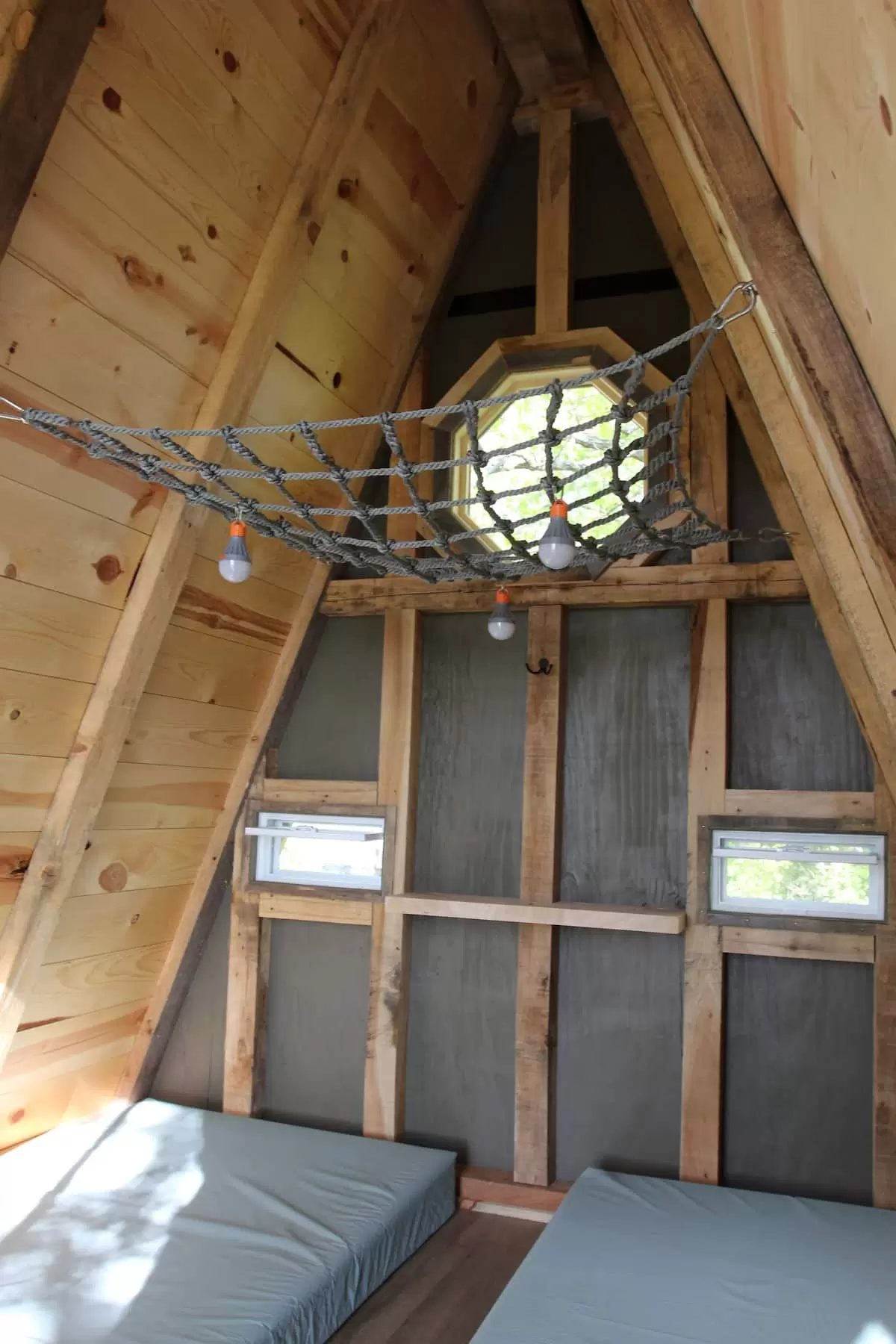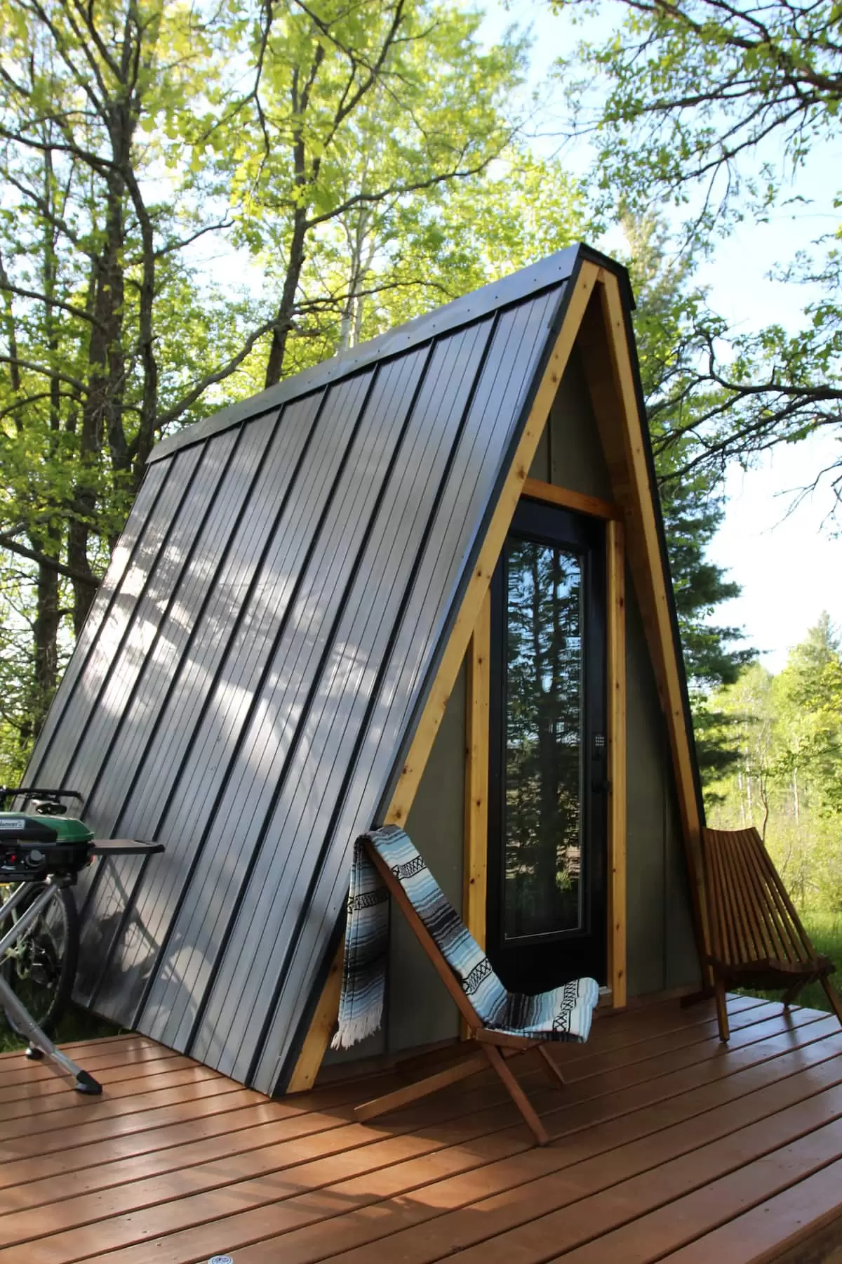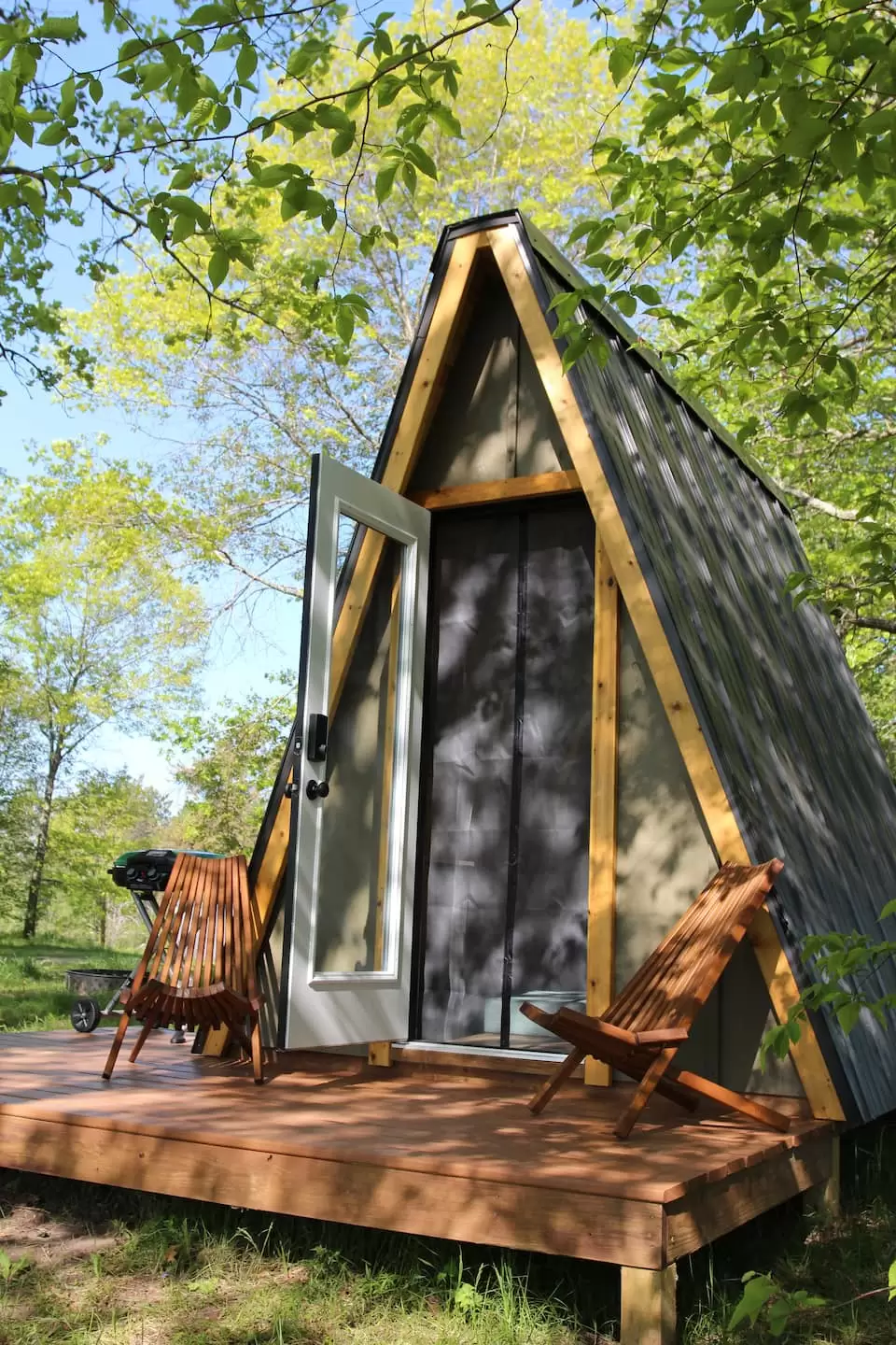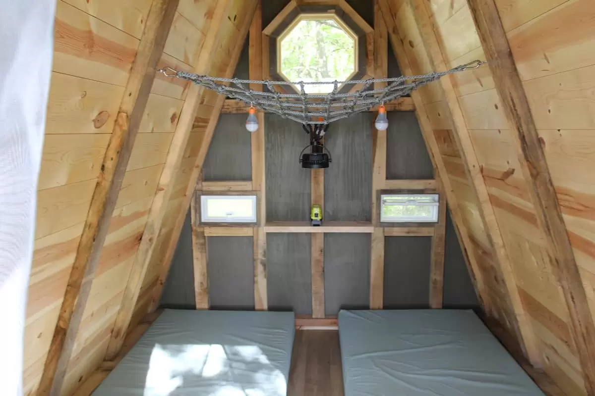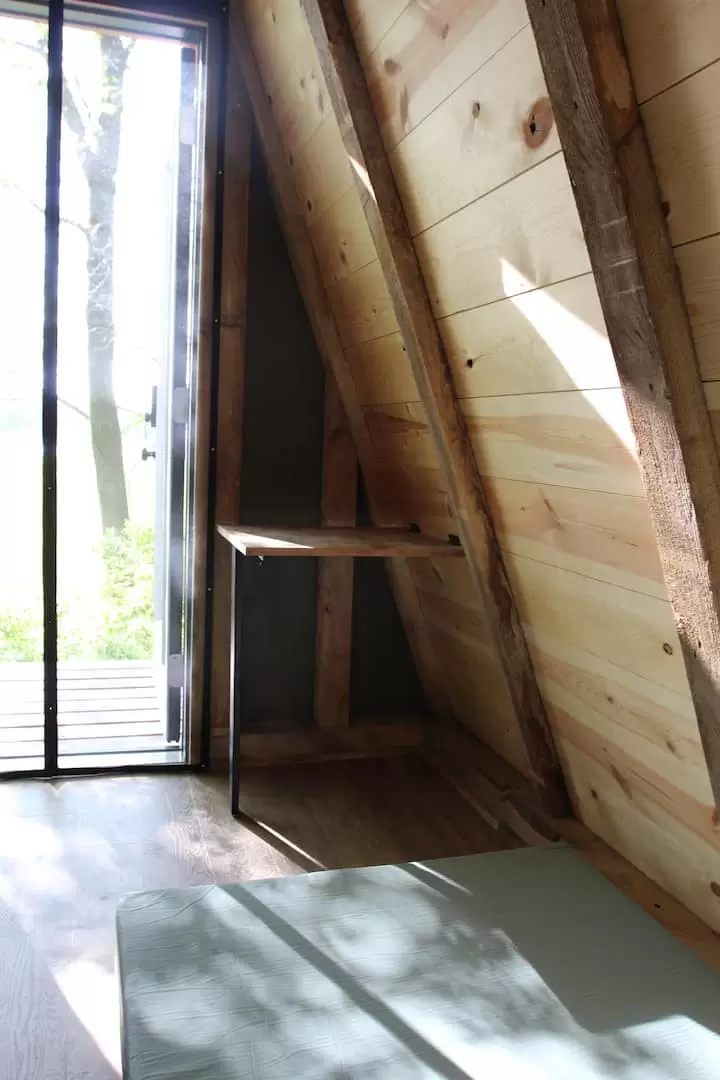 There are three A-frames on the property, thoughtfully positioned 75–100 feet apart and facing away from one another for privacy. A shared bathhouse is centrally located between the cabins. Think of it as a small campground.